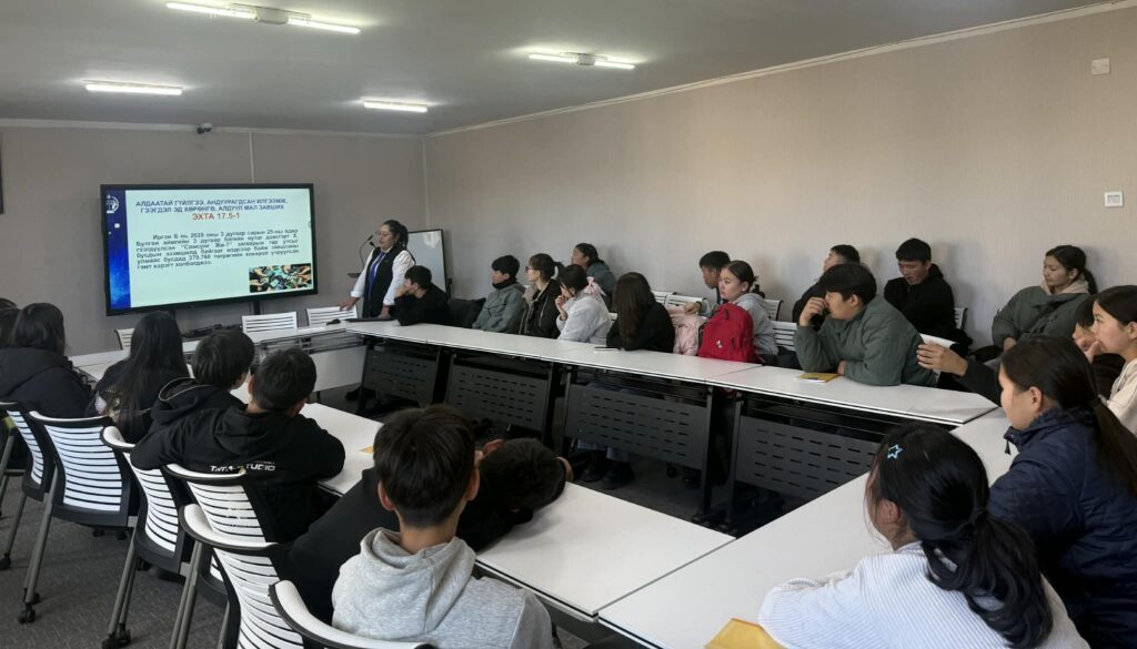 Булган аймгийн Ерөнхий боловсролын “Эрдмийн өргөө” цогцолбор сургуулийн 10 дугаар ангийн сурагчдад мэргэжил сонголтоо хийх, мэргэжлийн чиг баримжаа олгох зорилгоор 2025.10.24-ний өдөр шүүхийн зохион байгуулалтын хэлтсийн дарга Б.Азжаргал нь шүүхийн үйл ажиллагаа болон шүүхийн байр, шүүх хуралдааны танхимыг танилцууллаа.