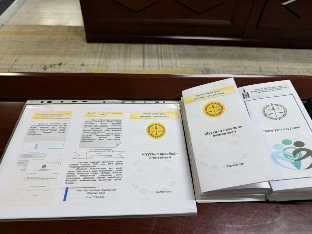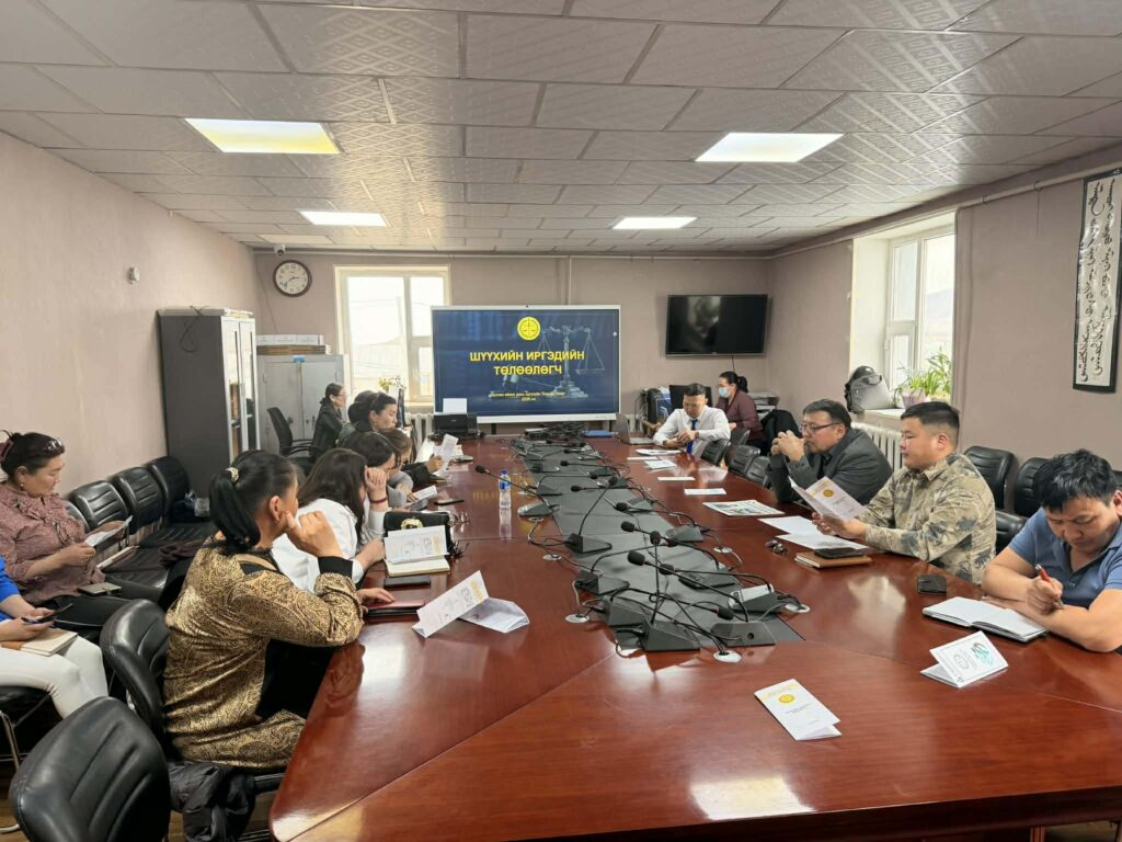 2026 оны 03 дугаар сарын 25-ны өдөр Зохион байгуулалтын хэлтсийн дарга Б.Азжаргал нь Булган аймгийн Орхон, Хишиг-Өндөр сумдаас 2026-2027 онд шүүх хуралдаанд иргэдийн төлөөлөгчөөр сонгогдсон иргэдэд, эвлэрүүлэн зуучлагч С.Гончигбал нь сумын иргэдэд эвлэрүүлэн зуучлалын талаар сургалт мэдээлэл өглөө.